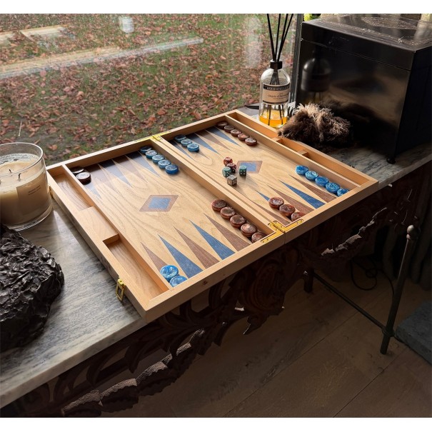 Backgammon Pliable 38cm en Loupe de Noyer Bleu et Brun