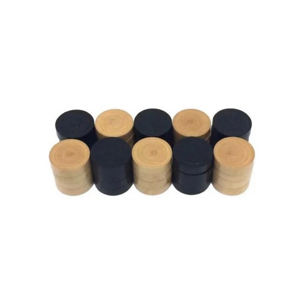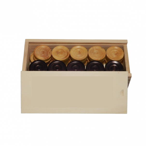 Ces pièces de dames Deluxe en bois de frêne noir et naturel ont un diamètre de 35 mm et sont livrées dans une boîte en bois avec un couvercle coulissant.
