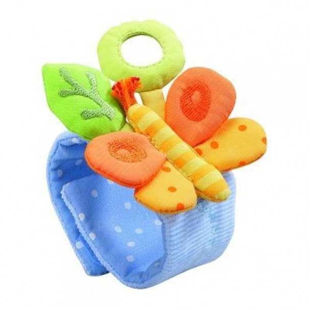 Hochet bracelet - Vol de papillons Un jouet pour entendre, toucher, voir et attraper. Un jouet pour les bébés actifs, en plus, accroché au poignet ou à la cheville il ne tombera pas de la poussette...