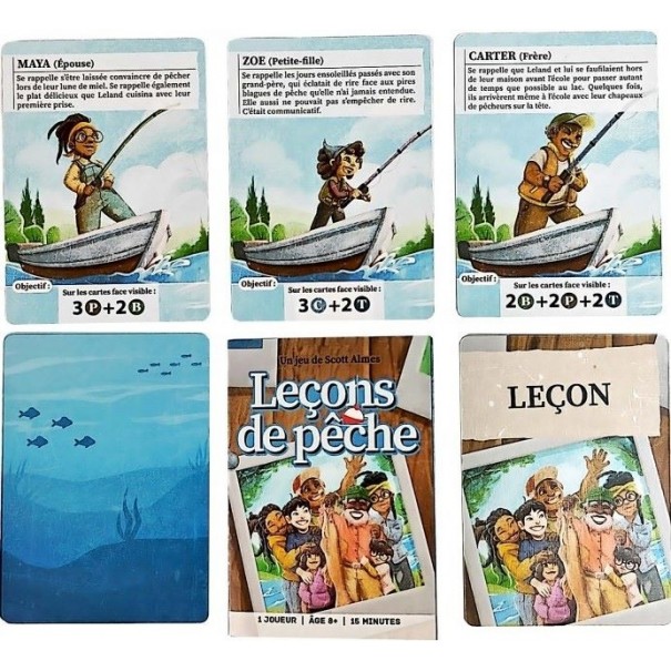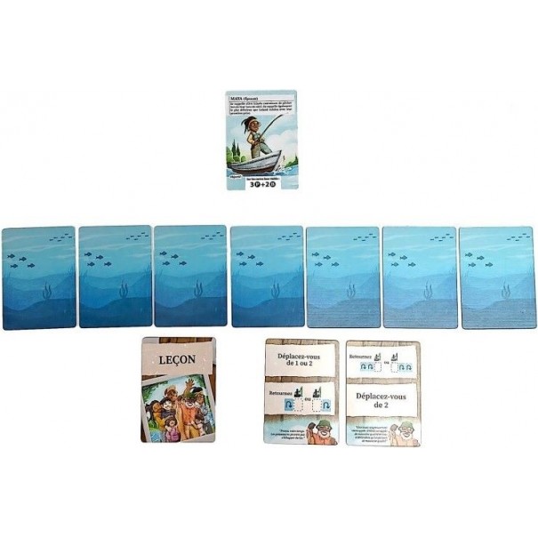 Les leçons sont utilisées pour déplacer le bateau de votre personnage le long de la rangée de cartes Lac ou pour retourner les cartes Lac, afin de cacher ou de révéler les poissons dont vous avez besoin pour atteindre l'objectif de votre personnage.