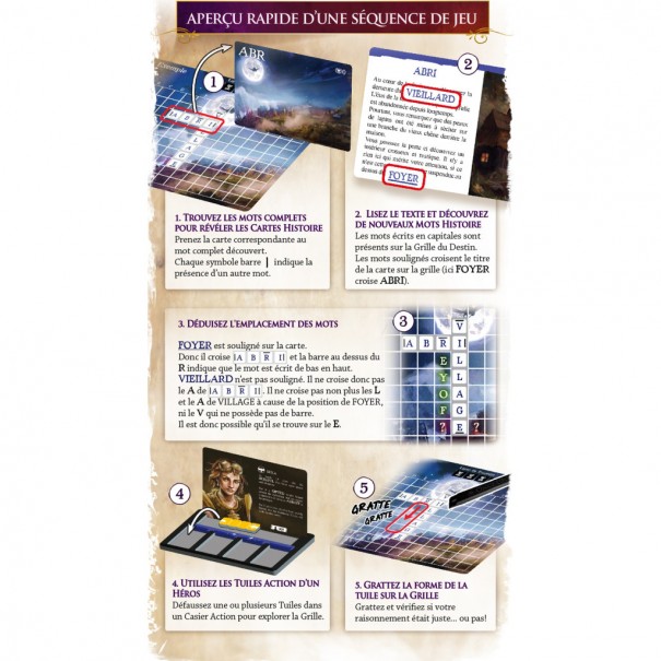 Pour jouer, choisissez parmi tous vos Héros, chacun ayant ses propres talents uniques. Puis, plongez dans des histoires de plusieurs heures et explorerez-les à l’aide de la Grille du Destin. Les Grilles du Destin utilisent de l’encre à gratter, de sorte que chaque décision que vous prenez modifie l’histoire en gravant physiquement vos actions sur la grille. Chacune de vos actions fera apparaître des lettres ou des symboles vous permettant d’arpenter de nouveaux lieux, rassembler des objets et accomplir des quêtes.