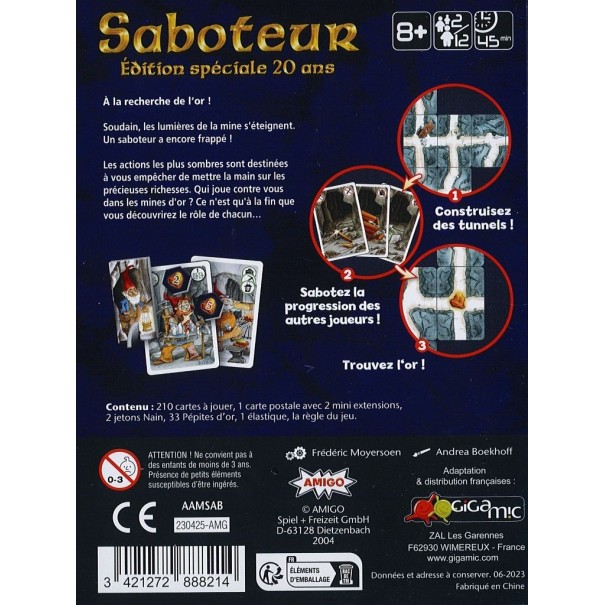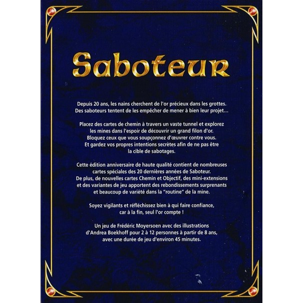 Cette édition anniversaire de haute qualité contient de nombreuses cartes spéciales des 20 dernières années de Saboteur. De plus, de nouvelles cartes Chemin et Objectif, des mini-extensions et des variantes de jeu apportent des rebondissements surprenants et beaucoup de variété dans la “routine“ de la mine.