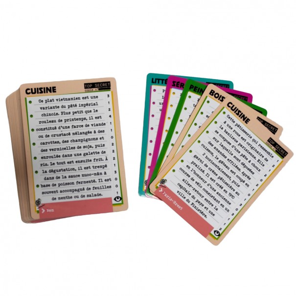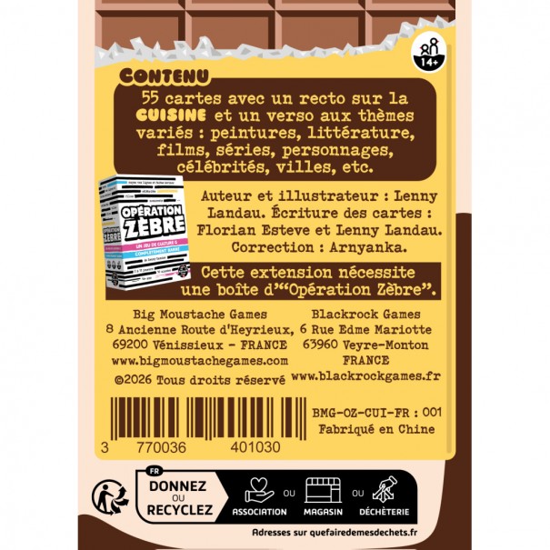 Opération Zèbre : Extension Cuisine est une extension de 55 cartes recto-verso (soit 110 nouvelles cartes à faire deviner) introduisant de nouveaux thèmes, dont la cuisine, à rajouter à votre jeu de base.