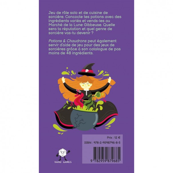 C’est un jeu de rôle solo et de cuisine de sorcière. Concocte tes potions avec des ingrédients variés et vends-les au Marché de la Lune Gibbeuse. Quelle sera ta réputation et quel genre de sorcière vas-tu devenir ? Potions & Chaudrons peut également servir d’aide de jeu pour des jeux de sorcières grâce à son catalogue de pas moins de 48 ingrédients !