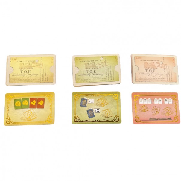 Pour ce faire, les joueurs collectent des ressources colorées, symbolisées par de petites locomotives, qu’ils utilisent pour acheter leurs cartes de voyage.