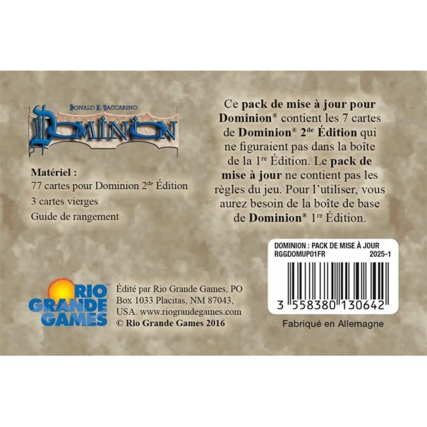 Ce pack de Mise à Jour contient les 77 cartes qui n'étaient pas présentes dans la première édition du jeu Dominion.