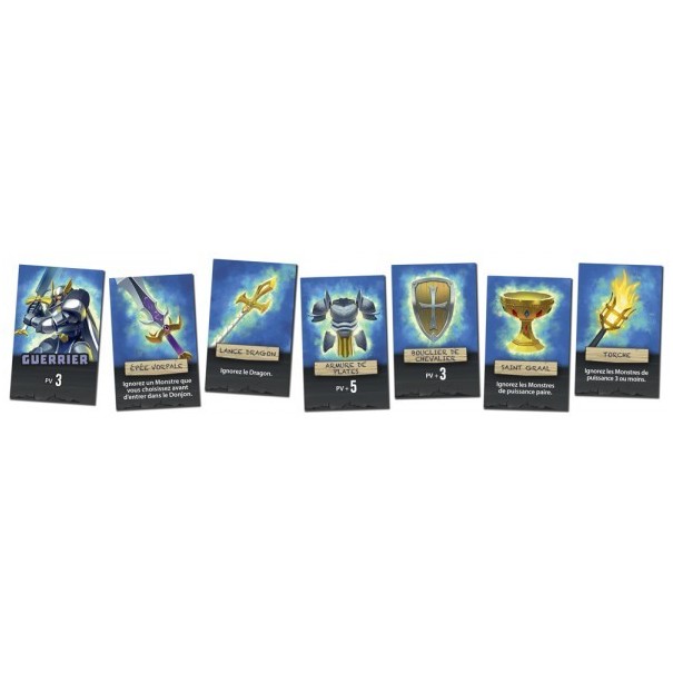 Contenu : 13 cartes Monstre, 4 cartes Aide de jeu, 4 tuiles Aventurier, 28 tuiles Équipement, 8 cartes Réussite et un livret de règles.