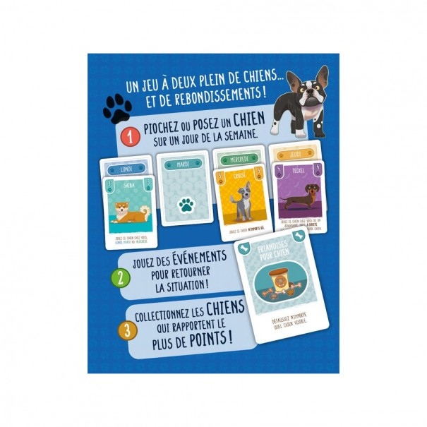 Remplissez votre semaine d’adorables chiens pour gagner un maximum de points ! Utilisez au mieux les effets propres à chaque animal pour attirer les meilleures cartes ou contrecarrer les plans de votre adversaire. Complétez votre semaine en premier pour mettre fin à la partie et compter vos points.