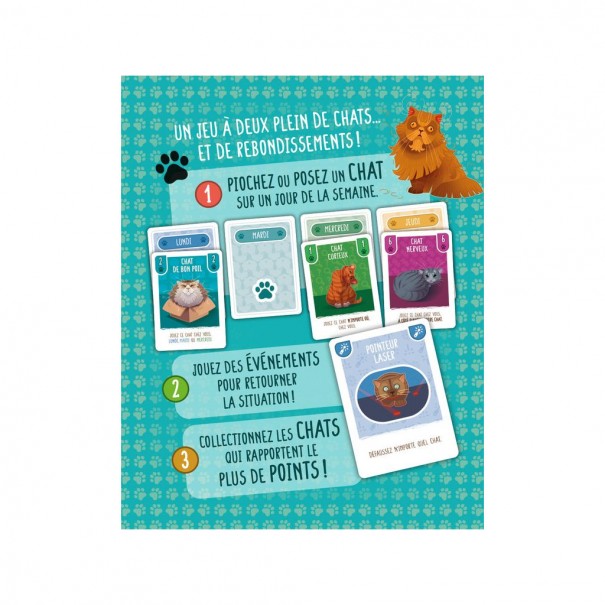 À votre tour, piochez une carte ou posez un chat sur un jour libre de votre semaine : certains ne peuvent être joués que sur des jours précis, ou adjacents à un congénère spécifique. D’autres permettent de recouvrir une carte, ou de l’envoyer chez votre adversaire. Enfin, vous pourrez tirer profit des cartes Événement pour déplacer, défausser ou échanger des chats, et retourner ainsi la situation à votre avantage !