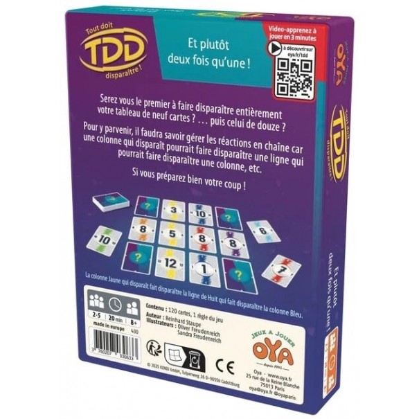 Dans le jeu TDD : Tout Doit Disparaître, les joueurs posent devant eux un tableau de cartes numérotées qu'ils devront réussir à faire disparaître entièrement, d’abord en configuration 3x3, puis 3x4 pour corser la partie.