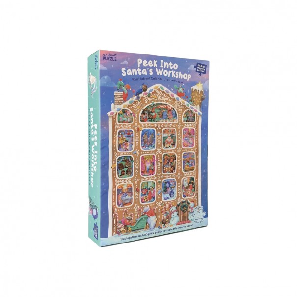 Ouvrez les fenêtres une par une, pour découvrir chaque jour une partie de l'atelier du père Noël ! Chaque petite boîte contient un puzzle de 20 pièces. Une fois les 24 puzzles assemblés, vous pourrez reconstituer la maison de pain d'épice de 480 pièces.